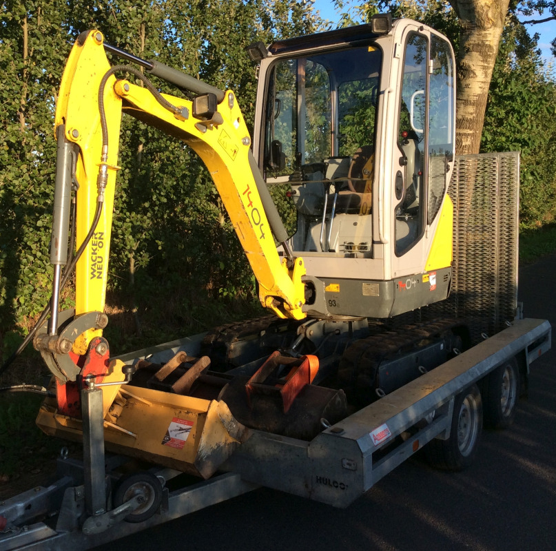 Im Mietpreis enthalten ist der Transportanhänger ein 1000 mm Grabenräumlöffel sowie ein 300mm Tiefenlöffel.